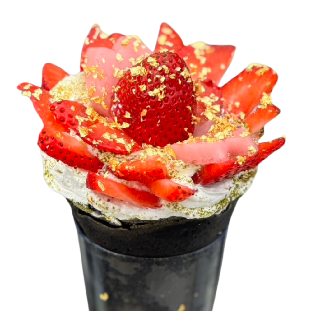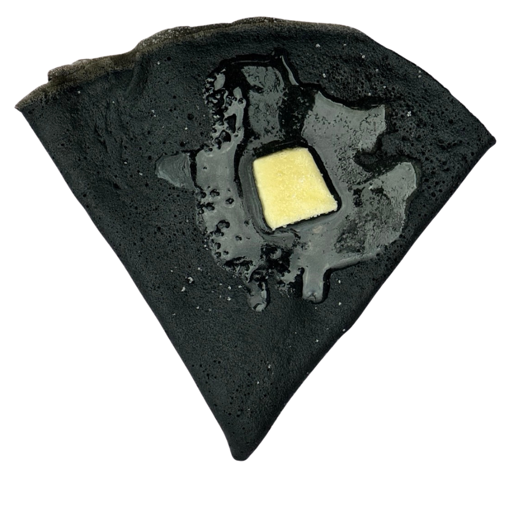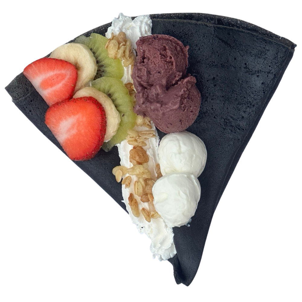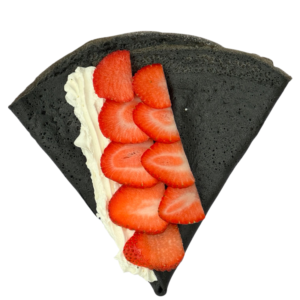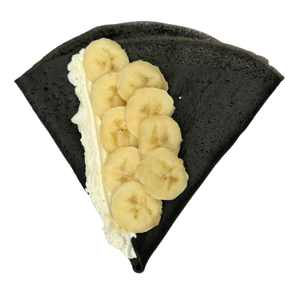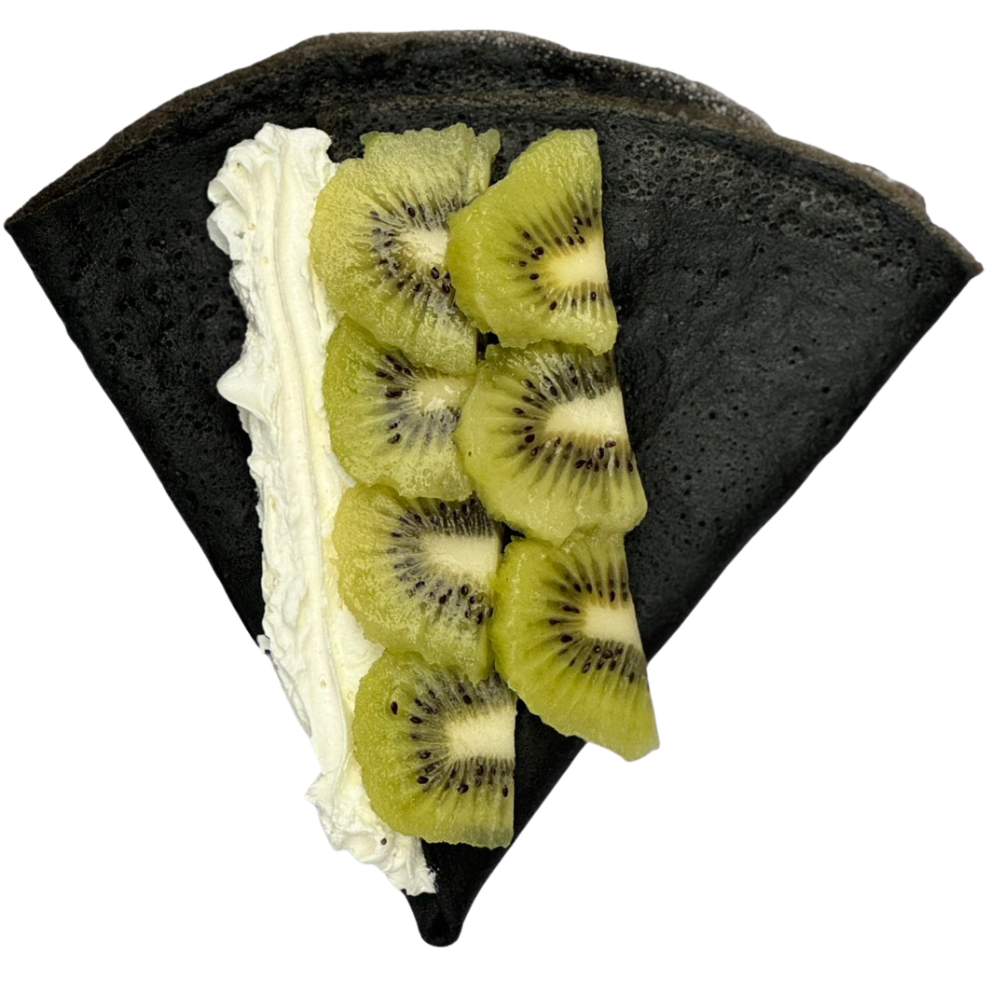 竹が名産の嵐山ならではの生地に食用竹炭を練り込んだミネラル豊富な黒いクレープです。